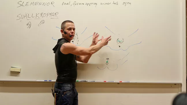 Lördagens sista föredrag var ett transcentrerat och cis-inkluderat lustanatomipass med Mina Gäredal, sjuksköterska och tidigare RFSU-informatör. Han lyckades prata om hur kroppen fungerar utifrån ett lustfyllt perspektiv utan att använda några könskodade ord en enda gång. Istället för att utgå från kuk och fitta utgick han från gemensamma benämningar såsom svällkroppar och slemhinnor.