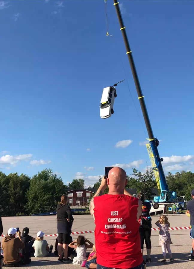 På Rosenholms körplan är EPA-traktorer snyggt uppradade. En är grönskimrande som en skalbagge, en annan inredd med svart pälstyg och fransar. Man kan förstå att deras ägare stolt visar upp sina ögonstenar här på träffen för motorburen ungdom. Men just nu är hela eventets deltagare samlade vid körplanens bortre del. En bil hissas upp i en kran och ska strax släppas ner med en krasch. Ett hundratal ungdomar tittar storögt på. Först släpps en bil från ganska låg höjd, det ska föreställa hur det är att krocka i 30 km i timmen, den högst tillåtna hastigheten för just en EPA-traktor. Bilen blir lite bucklig, men det ser inte så farligt ut. Nästa bil hissas upp betydligt högre. Spänningen stiger - hur ska det gå nu?