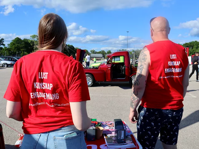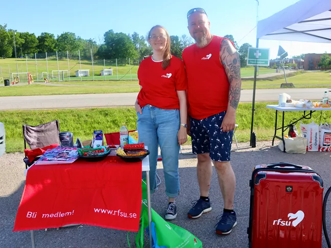 Efter den pedagogogiska uppvisningen återgår ungdomarna till att visa upp och beundra varandras fordon. De flesta ser ut att vara runt 15 år, alltså den ålder man behöver ha för att ta så kallat AM-körkort. Men det finns även ett annat dragplåster på körplanen denna dag: RFSU Blekinges informationsbord. Bakom det står Katarina Nordin och Magnus Gärdebring från lokalföreningens styrelse.