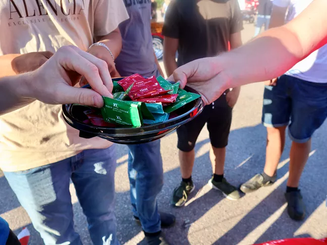 Mestadels tycks det vara kondomerna som lockar ungdomarna att närma sig. Någon kommer och frågar om hennes kompis kan få kondomer. Han är för blyg för att gå fram själv säger hon. Ett gäng lite kaxigare killar frågar om dom får ta.