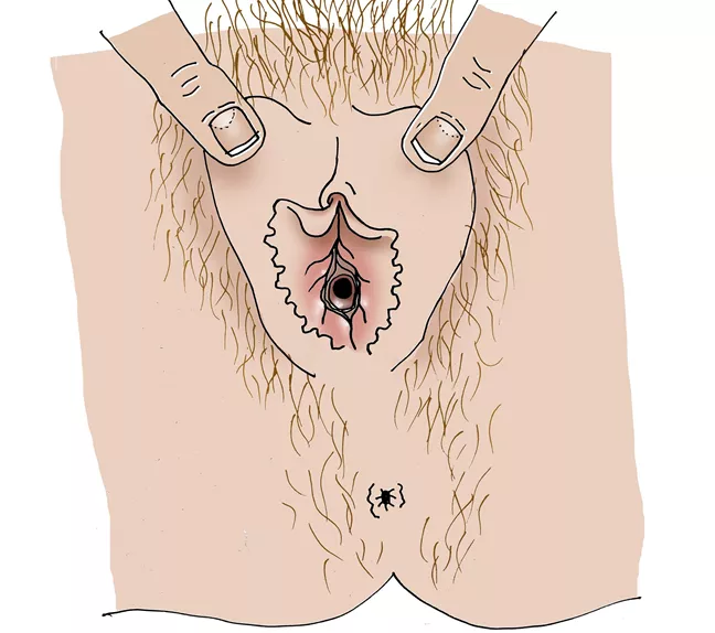 Det som finns i slidans öppning kallar vi på RFSU i stället slidkrans. Det är en veckad kant av tunn och fuktig hud, en slemhinna. Slidkransen finns en bit innanför slidöppningen.