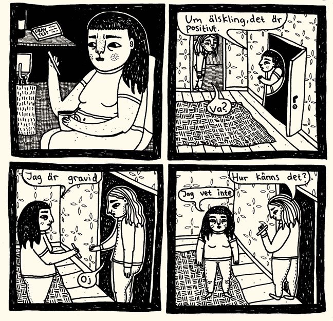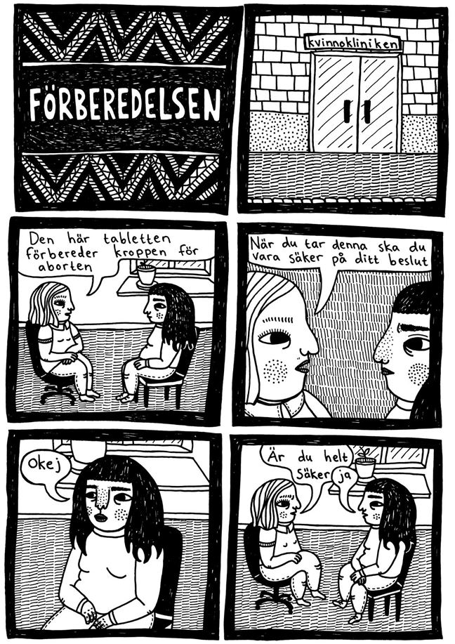 Serienovellen Två streck = gravid är tecknad av Julia Hansen och utgiven av RFSU. Den innehåller Julias egen berättelse om när hon gjorde abort. Om kroppen. Om oro och frustration. Om kräks, smärta, tårar och blod. Men också om glädje och lättnad över att göra något som känns helt rätt.